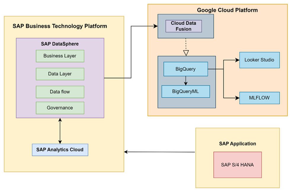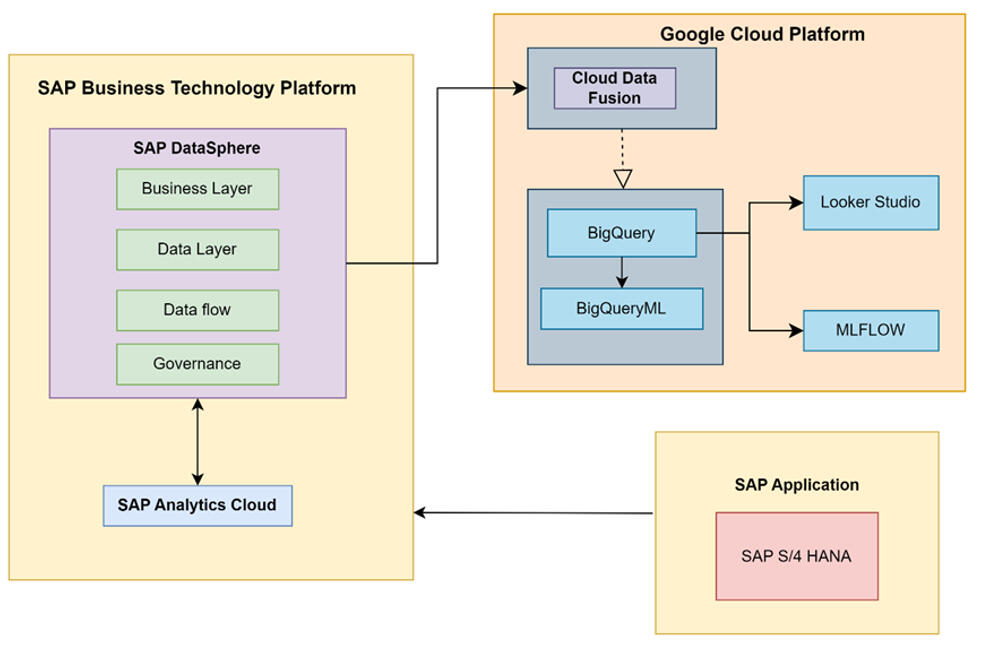 1. Die Integration von Unternehmenssystemen (SAP) mit Cloud-Analytics-Plattformen (GCP) schafft eine skalierbare Grundlage für End-to-End-ML-Pipelines – von der Datenintegration über Prognosemodelle bis hin zur interaktiven Visualisierung für fundierte Fertigungsentscheidungen.