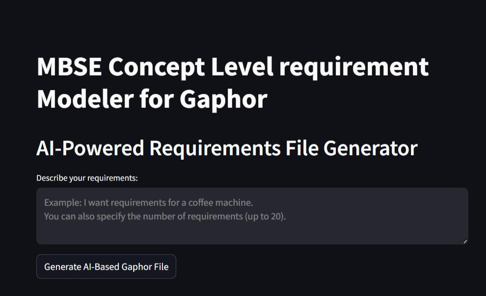 1. Direkteingabe-Workflow: Nutzer definieren bis zu 20 Anforderungen mit Titel und Beschreibung. Das System generiert daraus eine herunterladbare .gaphor-Datei, die unmittelbar weiterverwendet werden kann. Dies erleichtert insbesondere Anwendern ohne Modellierungstool-Erfahrung den Einstieg.