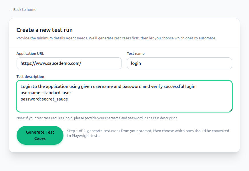 2. Geben Sie Ziel-URL, Testnamen und Beschreibung ein und klicken Sie auf „Testfälle generieren“.
