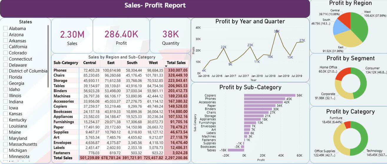 3. Nutzen Sie Slicer und interaktive Visualisierungen, um Umsatz und Gewinn nach Bundesstaaten, Regionen, Segmenten und Produktlinien zu analysieren.
